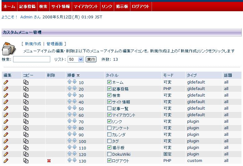 Geeklogの場合、config.phpの $_CONF['menu_elements'] の設定変更と、CUSTOM_menuEntries 関数の組み合わせで、ほぼ自由にメインメニューのエントリーをカスタマイズできるわけですが、PHPプログラムの知識や、エディタでの編集が必要であり、とても面倒でした。